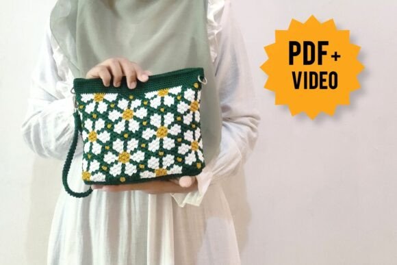 The finished crochet handbag measures approximately 17 × 22 cm with a supportive base, making it suitable for carrying daily essentials such as a phone, wallet, and sunglasses. Fingering weight yarn allows the daisy motifs to remain crisp and detailed, creating a lightweight yet elegant crochet bag.