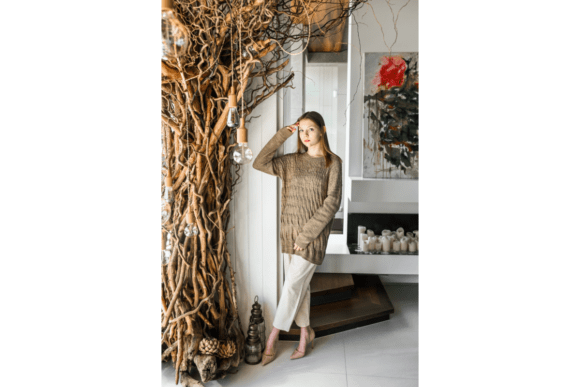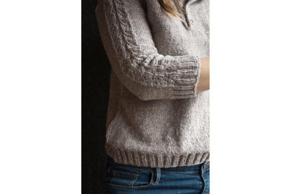 Fine Shetland wool worked in continuous lace creates surprisingly wearable elegance. Top-down modified drop sleeves with underarm gussets provide comfortable fit, while simple rolled stockinette neck keeps finishing minimal and clean.