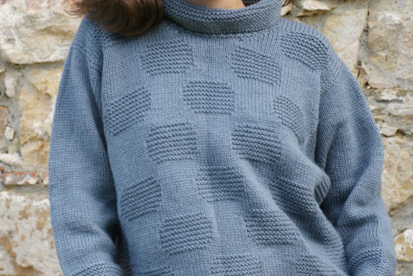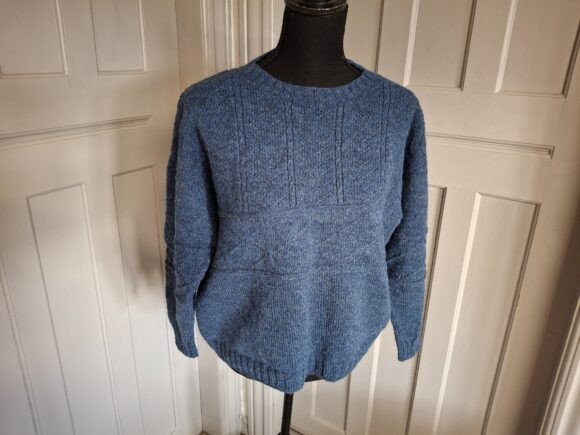 True unisex proportions (39¼″–58¼″ bust) with gents length adjustments included. Circular needle work until armholes, then flat finishing offers construction flexibility. Durable 2-ply jumper weight creates substantial fabric built for decades of wear.