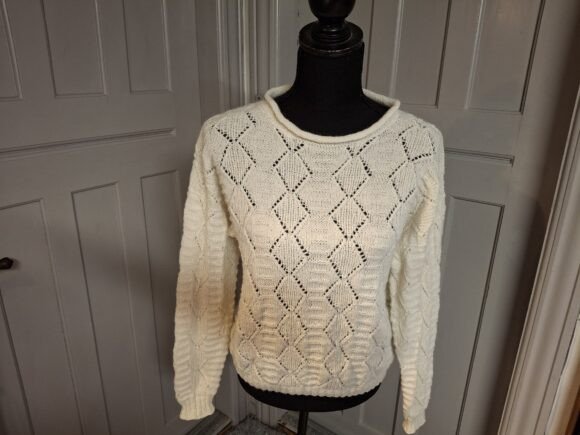 The versatile silhouette (33½″–45¼″ bust) layers beautifully over dresses or pairs casually with denim. Cropped length and optional vest styling give it modern edge. Fisherman rib construction produces soft, cushioned fabric with excellent warmth.