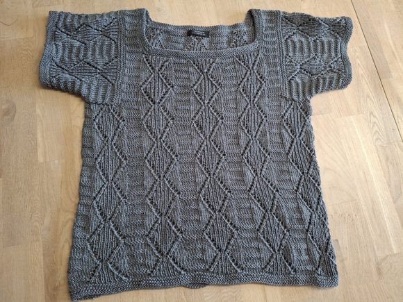 Summer-weight lace and square neckline create breathable warm-weather knitting. Short modified drop sleeves provide coverage without weight, while garter stitch edges solve the eternal curl problem at hems and neckline.