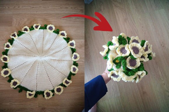Floral vibrancy translates into cozy functionality with this circular blanket pattern featuring dimensional sunflower and leaf motifs. The round format creates striking visual impact beyond standard rectangular blankets.