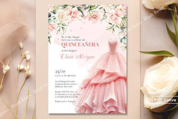 Glamorous, feminine, and utterly show-stopping — this Blush Pink Roses Formal Long Dress Invitation template is a true masterpiece of design. Originally crafted for Quinceañera celebrations, it translates beautifully to any formal wedding event. The blush pink roses set against an elegant long dress backdrop creates a truly memorable visual. The fully editable PSD file (5″×7″) is compatible with both Adobe Photoshop 5+ and Canva, giving you maximum flexibility. High-resolution design elements ensure every print is razor-sharp and beautifully detailed. Fonts used include Madelican, Rozha One, and Adobe Devanagari, creating a sophisticated layered typographic style that exudes luxury.