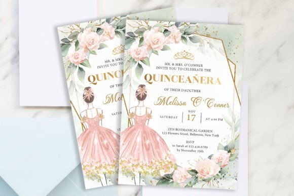 A fairy-tale invitation for your fairy-tale moment! This Princess Pink Dress Quinceañera Invitation features a gorgeous pink dress paired with a gold tiara, blush flowers, flowing eucalyptus, and an ornate gold frame — creating a storybook aesthetic that is pure magic. Delivered as a fully editable 5″×7″ PSD file, this design is as easy to personalize as it is beautiful to look at. Fonts include Glamour Line, Le More Collection, and Adobe Devanagari, combining elegance with a modern editorial feel. Unlimited edits and downloads are yours to enjoy, and print quality is guaranteed to satisfy the most detail-oriented bride or celebrant.