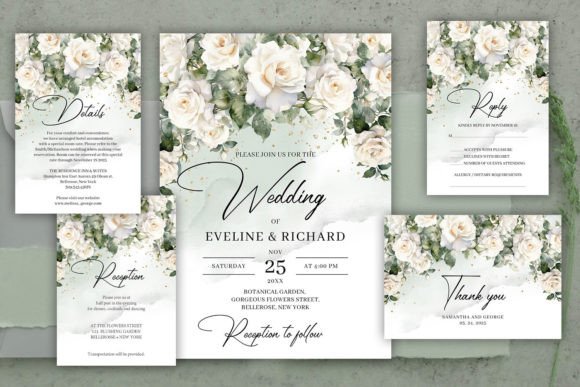 Technical Details: 4 PSD files | Invitation: 5″×7″ | Cards: 3.5″×5″ | Fonts: White Garden, Abhaya Libre, Montserrat Medium | Requires: Adobe Photoshop 5+