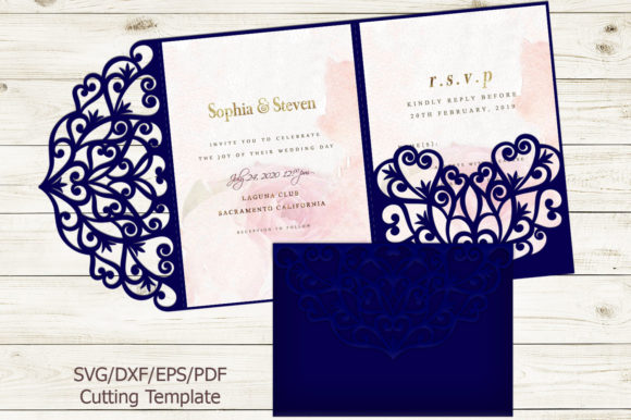 Looking for something with a little architectural flair? This Tri Fold Wedding Invitation Template turns a classic format into an unforgettable keepsake. The assembled envelope measures 5″×7″ (127×178mm), making it perfect for mailing. What really sets this template apart is its versatility — the ZIP bundle includes SVG, PNG, EPS, DXF, and PDF files, meaning it works seamlessly with Cricut Design Space, Silhouette Studio, Adobe Photoshop, Adobe Illustrator, CorelDRAW, and more. Whether you’re a DIY crafter or a design pro, this template adapts to your workflow. The clean, structured format gives your invitation a polished, premium feel that guests will admire long after your wedding day.